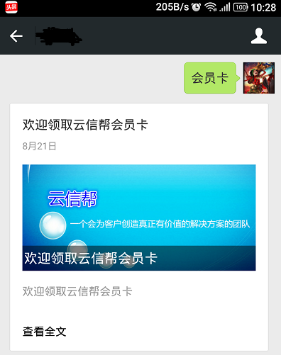 2 ) 填写完成后在手机端输入您所设的关键字即可弹出会员卡入口,如图所示: