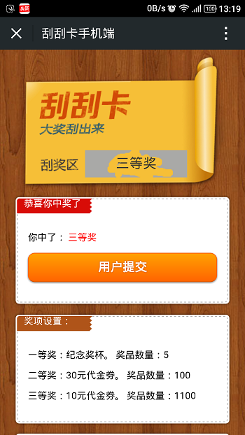 该模块可为商家提供刮刮卡抽奖服务,用户可以通过手机屏幕进行刮奖的游戏!