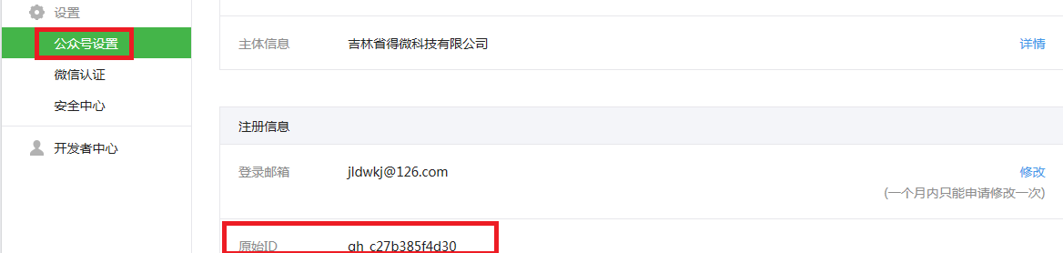 2、公众号原始id,这个很重要,公众平台进行通讯就靠这个ID(登录微信公众平台 mp.weixin.qq.com,点公众账号设置,查看原始id信息。)