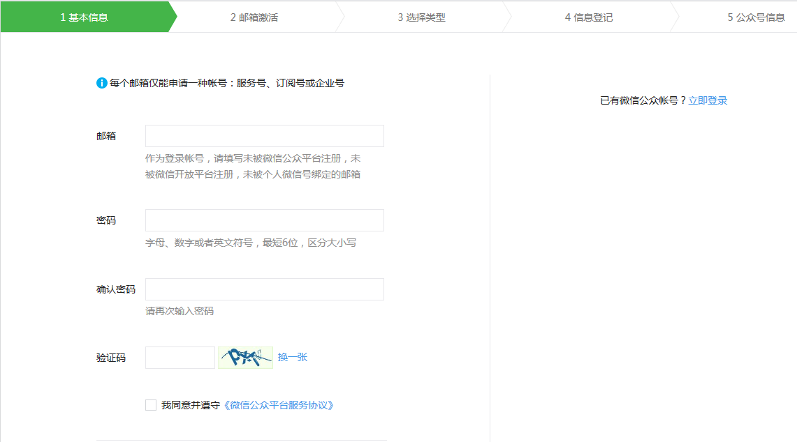 登录 mp.weixin.qq.com,点击注册填写相关信息即可申请微信公众号, 微信公众号只能在PC端登录,不能用手机端,公众号分服务号和订阅号, 企业可申请服务号,个人、媒体申请订阅号,服务号每个月限制群发四条, 而订阅号每天可发送一次,但订阅号消息会折叠起来放在订阅号的消息盒子里,服务号则是放在聊天列表。